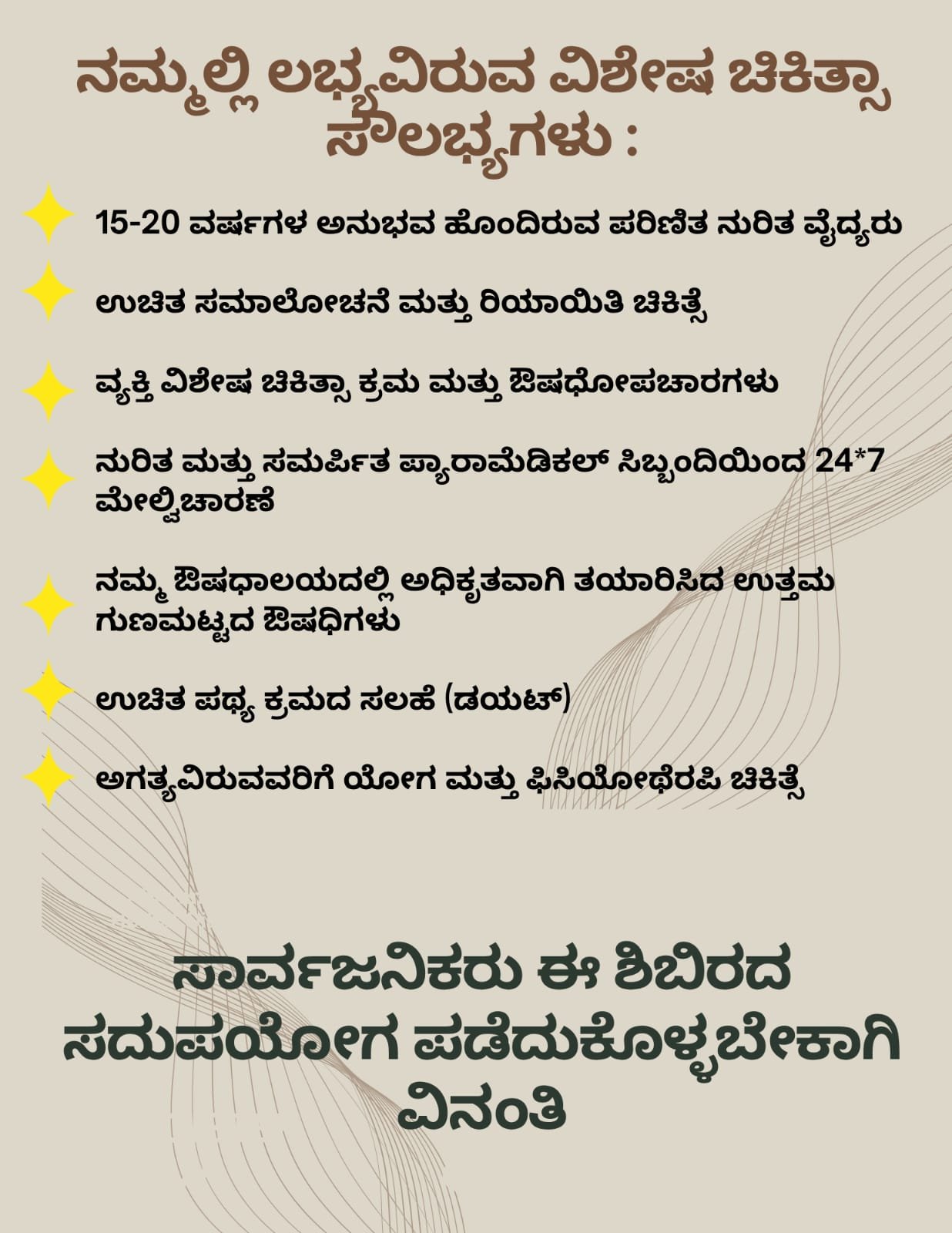ಕರ್ಕಾಟಕ ಚಿಕಿತ್ಸೆಯಿಂದ ಹಲವು ರೋಗಿಗಳ ನಿವಾರಣೆ ಸಾಧ್ಯ .ತಜ್ಞ ವೈಧ್ಯರಿಂದ ಉಚಿತ ಸಮಾಲೋಚನೆ ಮತ್ತು ರಿಯಾಯಿತಿ ದರದಲ್ಲಿ ಚಿಕಿತ್ಸೆ.